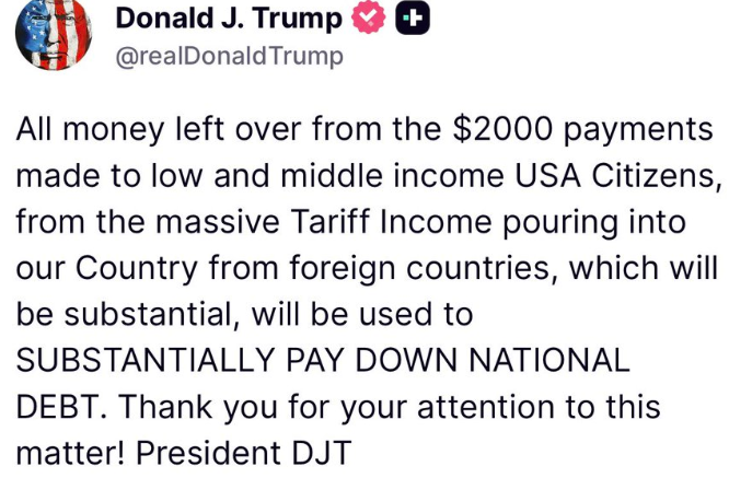 Erika York (VP of federal tax policy at Tax Foundation) posted to X, “If the cutoff is $100,000, 150M adults would qualify, for a cost near $300 billion. If kids qualify, that grows.” It’s clear that the numbers are close, and nearly all of the revenue produced would be spent handing out these stimulus checks. This is contrary to the president’s belief that there will be money left over to pay back our national debt; as he said, “We are taking in Trillions of Dollars and will soon begin paying down our ENORMOUS DEBT, $37 Trillion.”
