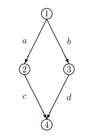 Now, assume that road segments a and d are narrow roads, so the speed of travel depends on the number of drivers (D) and is defined as the number of travelers divided by 100 (# of travelers driving at a time for travel time to equal 1 minute). Road segments b and c are highways that take 25 minutes to travel consistently, as highways have a speed limit and are designed for a faster flow of vehicles. Thus, the time to travel each route (1-2-4 or 1-3-4) is
