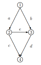 Now, the city has constructed an additional road e from point 2 to 3 which takes a consistent minute to travel, as seen in fig. 2. If the people continue taking their original route but those who take 1-2-4 optimize their route to 1-2-3-4 (so D is still equal to 1,000), taking this shortcut takes about 21 minutes through this equation